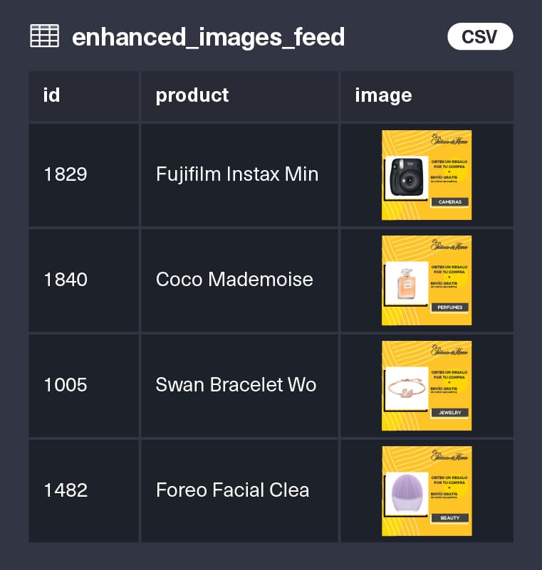 Connect your product feed directly into the Shakr platform, which will automatically create enhanced image assets for all your individual SKUs. Leverage your product data to create custom assets for different brands, features, categories or items on sale.